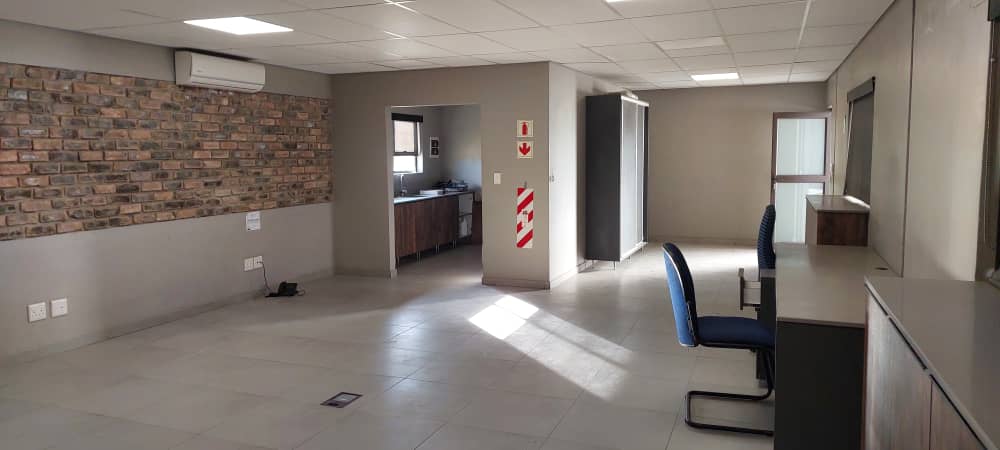 This newly designed office area features an open workspace alongside a private office. A kitchenette and separate WC are provided for added convenience.