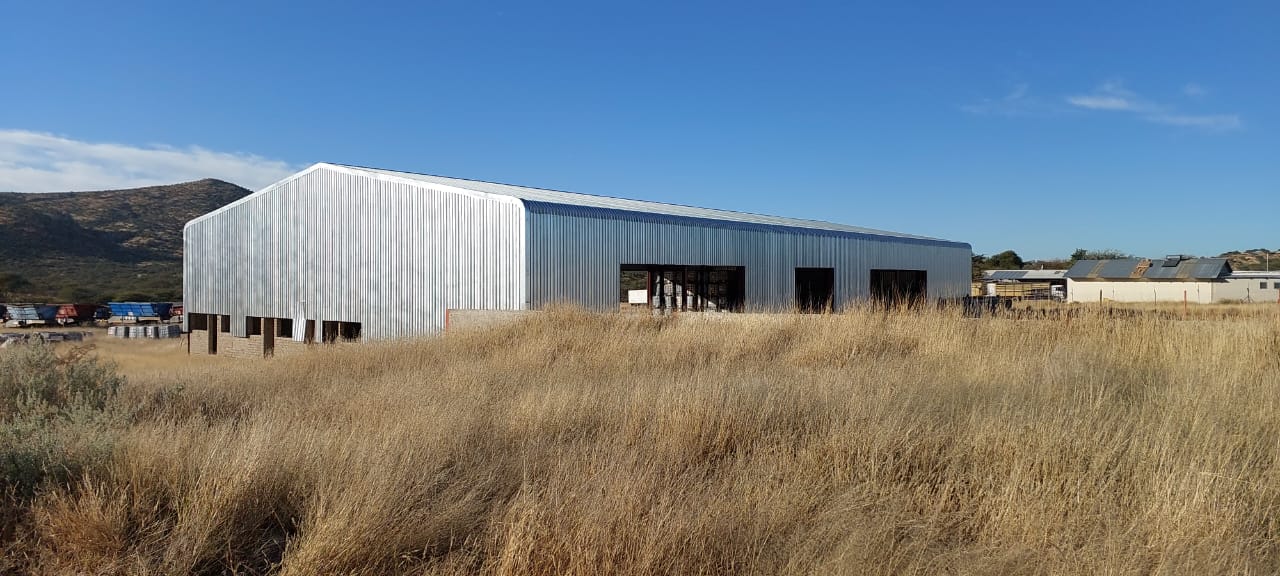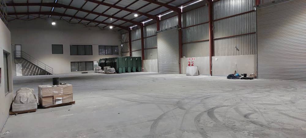 The new warehouse includes a ground-floor open warehouse area, reception space, and main storeroom. Both gender-specific ablution facilities are available along with a kitchenette and various storage areas. The first floor offers a slab storage area, three offices, and a conference & training room.