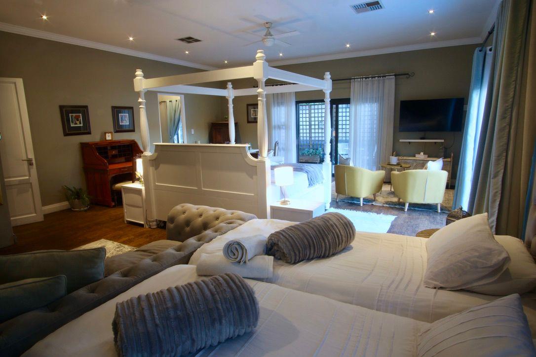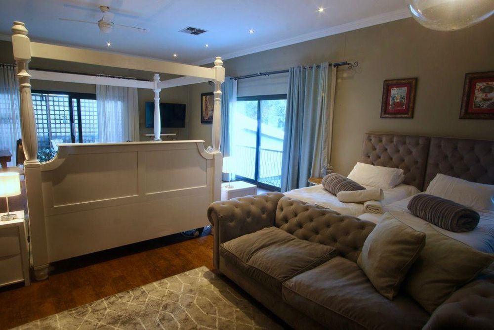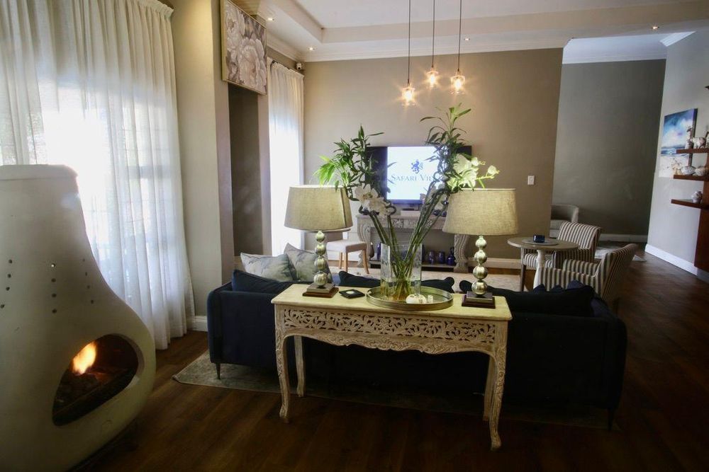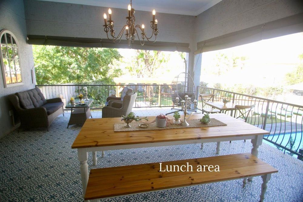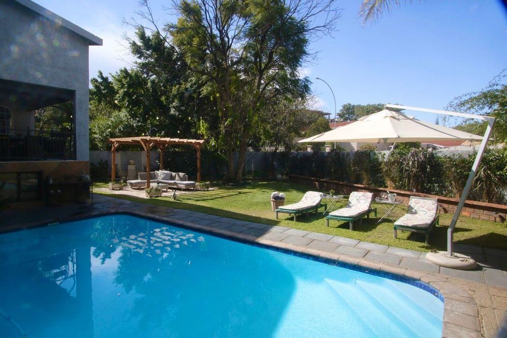 This double storey house has 7 Bedrooms with en-suite bathrooms, the grand main suite with its own private porch, a lounge with a gas fireplace, an open plan kitchen-dining room, an office, a built-in-braai and a guest toilet.