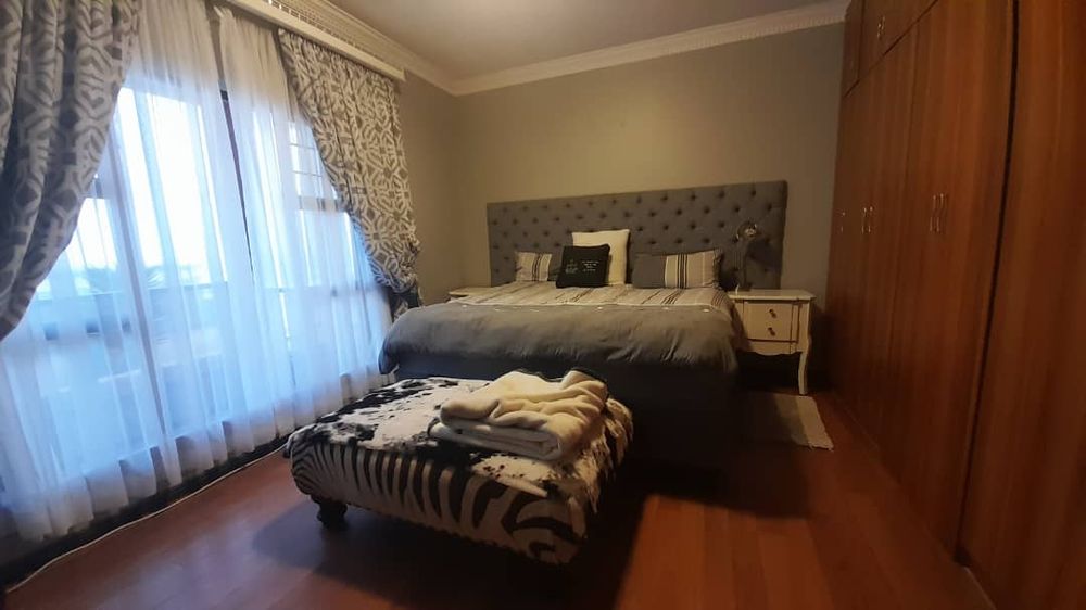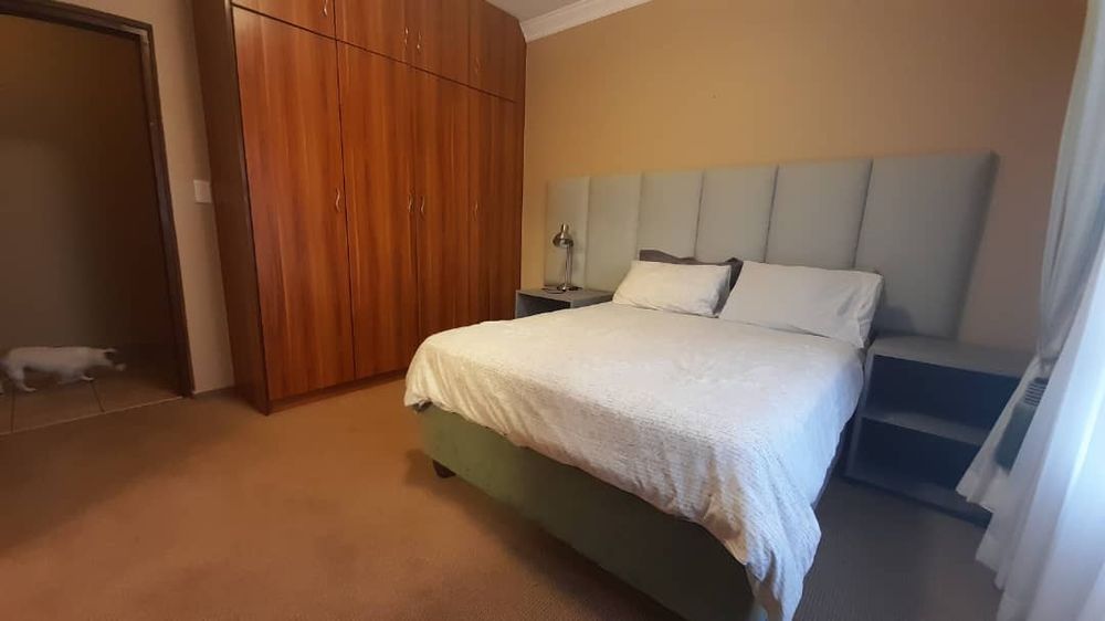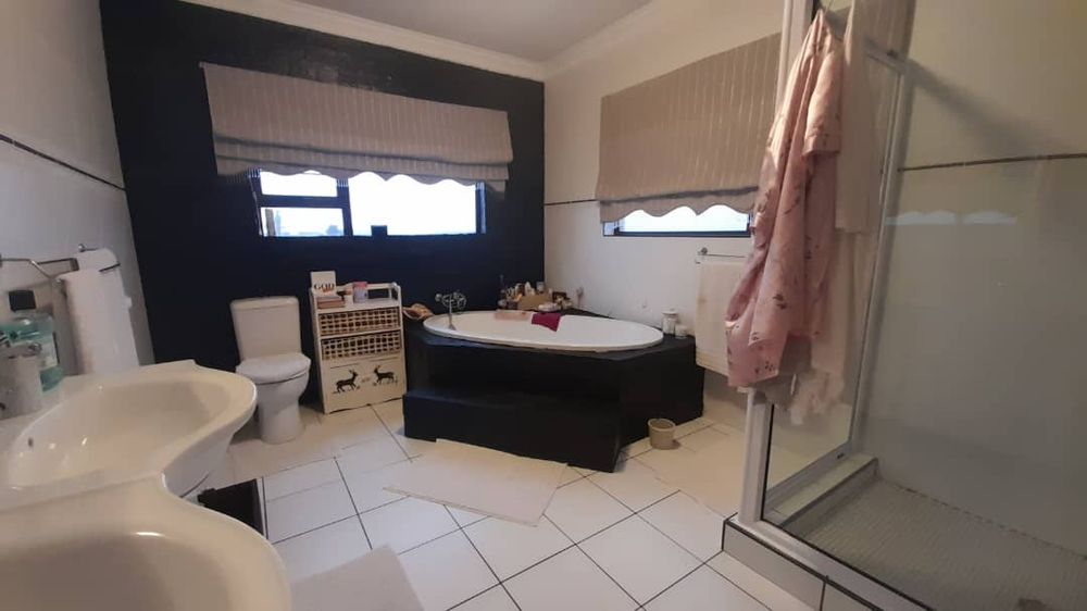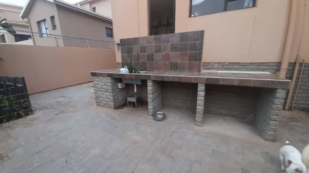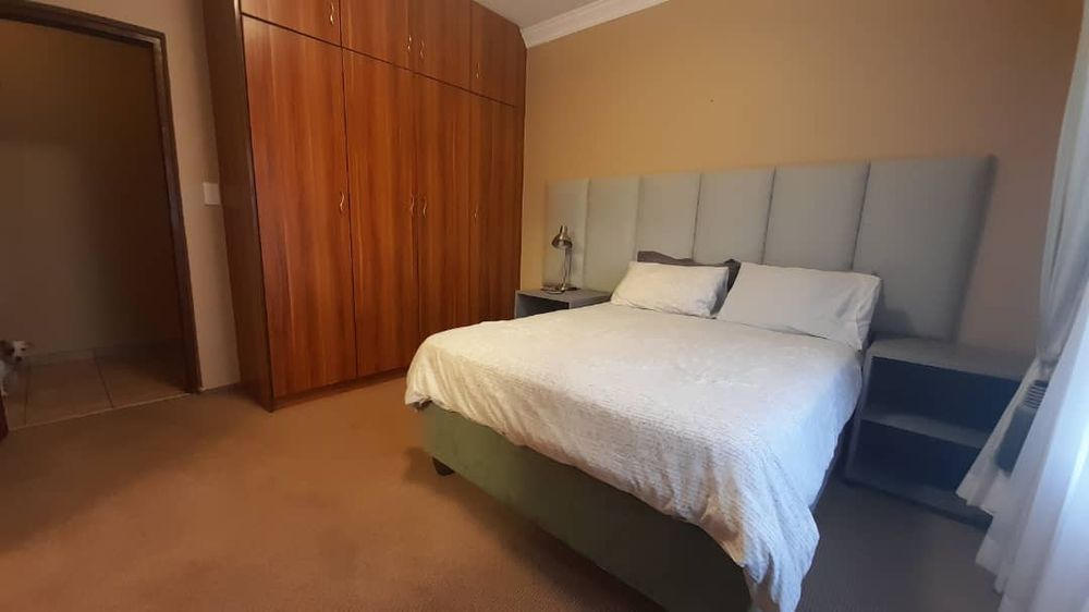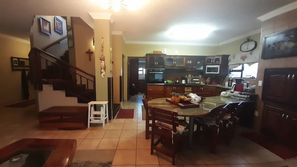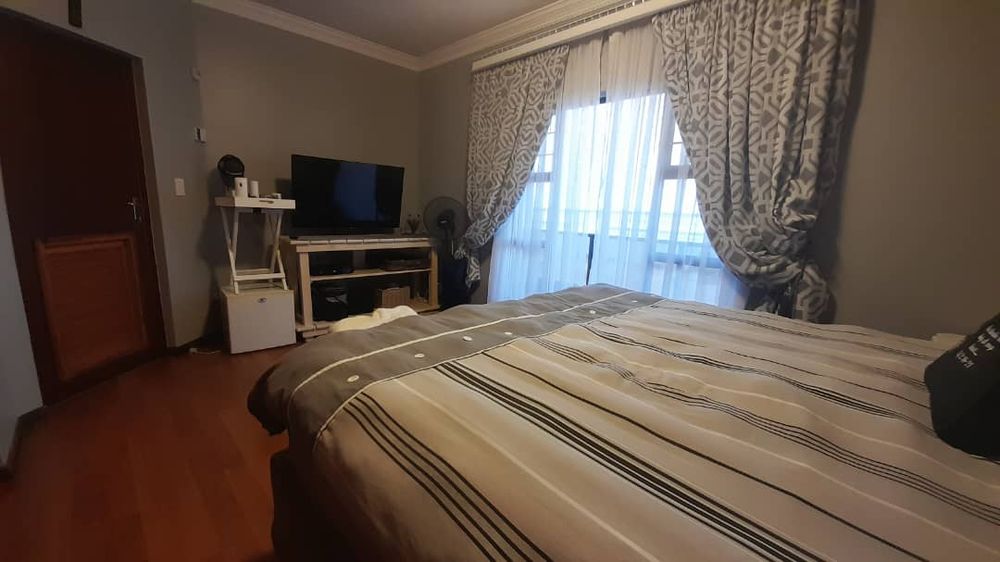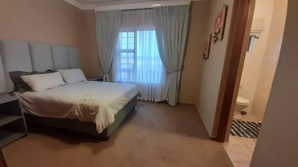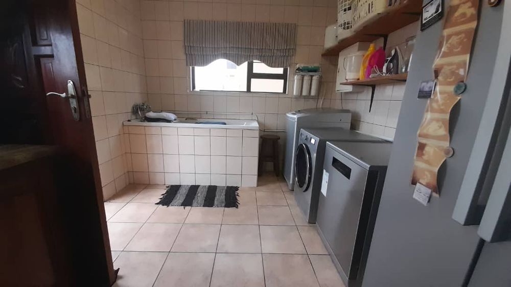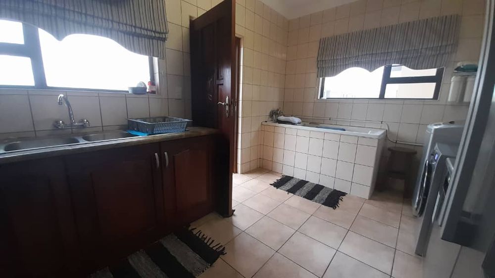 The ground floor features two generously sized bedrooms with en-suite bathrooms, a guest toilet, and an open plan kitchen with elegant rosewood cupboards that seamlessly flows into the living room. Other highlights include an indoor braai, pantry, scullery, and laundry room. The three-car garage, which can accommodate up to five cars, provides ample space for parking and storage. Additionally, there is a large storeroom and a versatile servant's room with a bathroom that can also serve as an extra bedroom.