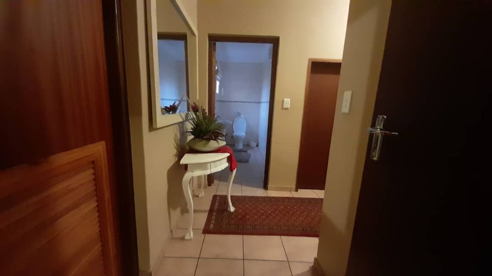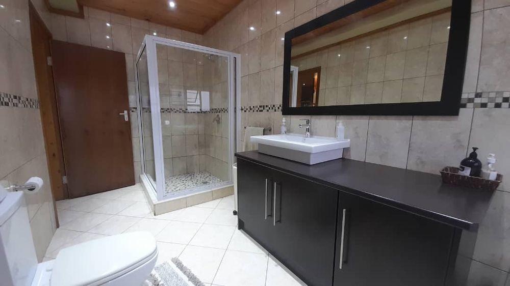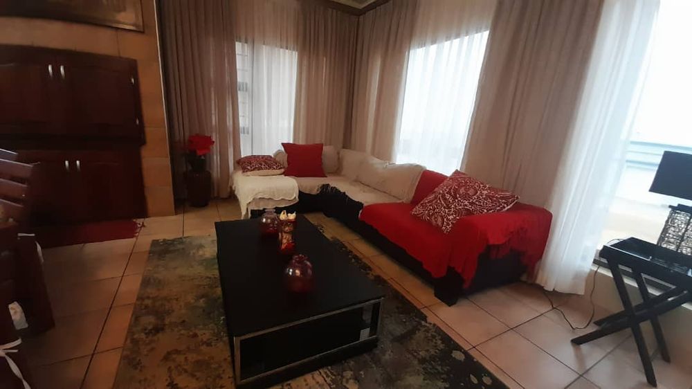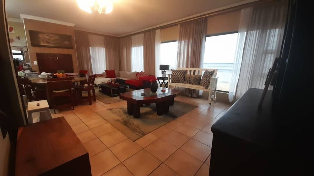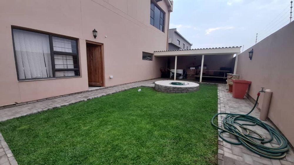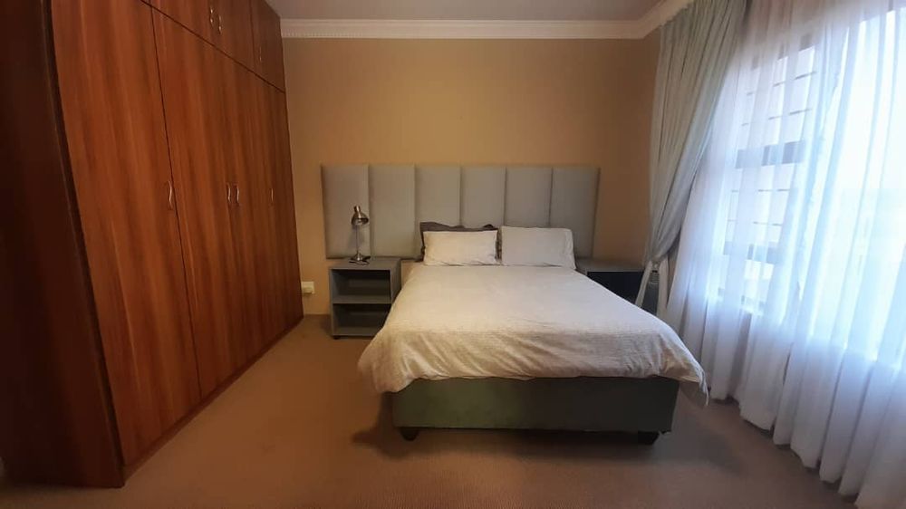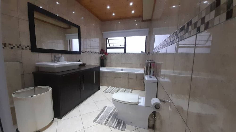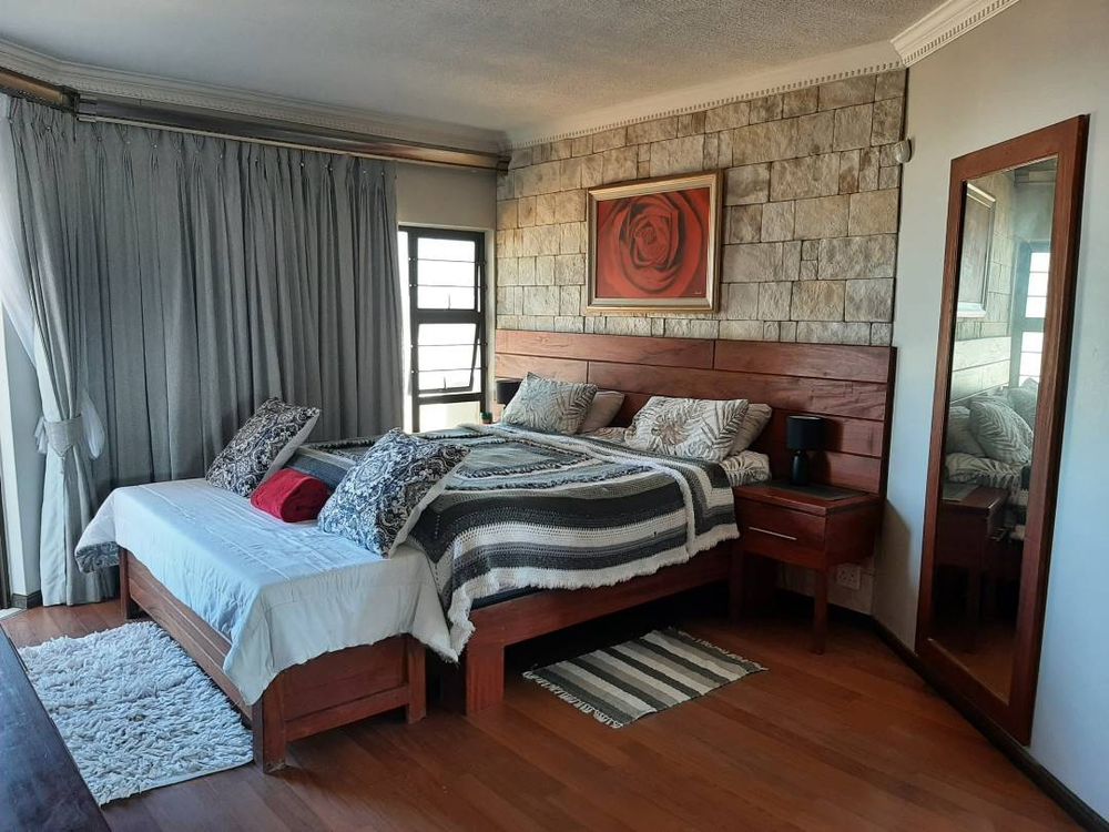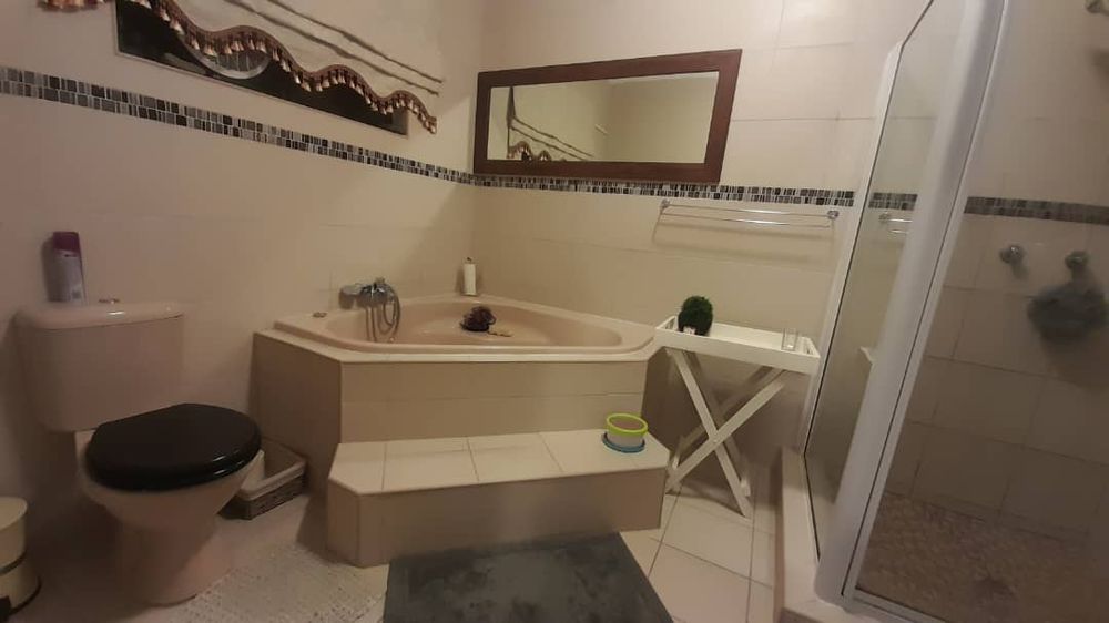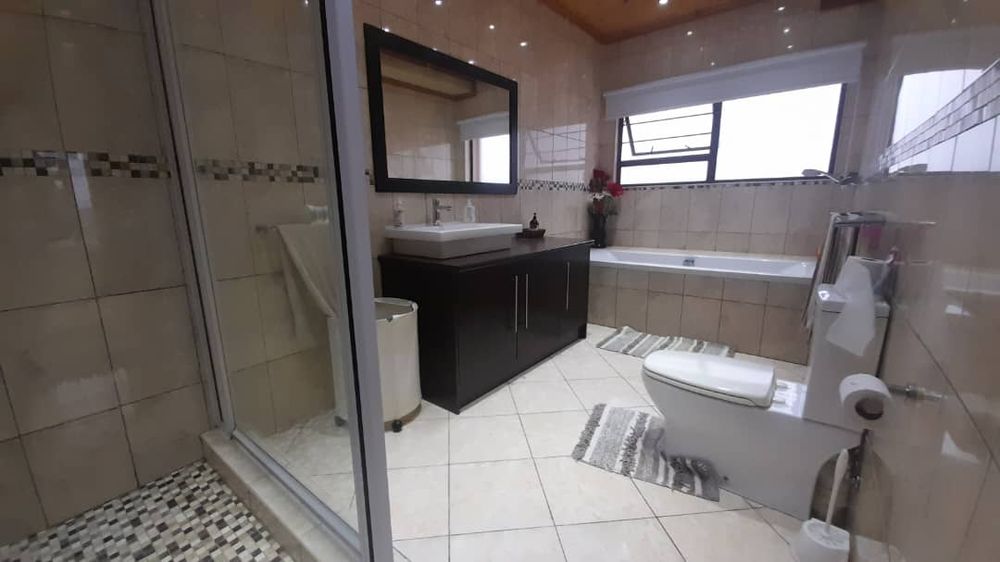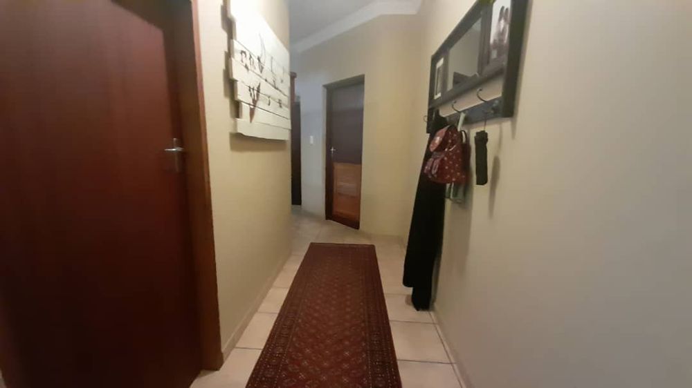 The ground floor features two generously sized bedrooms with en-suite bathrooms, a guest toilet, and an open plan kitchen with elegant rosewood cupboards that seamlessly flows into the living room. Other highlights include an indoor braai, pantry, scullery, and laundry room. The three-car garage, which can accommodate up to five cars, provides ample space for parking and storage. Additionally, there is a large storeroom and a versatile servant's room with a bathroom that can also serve as an extra bedroom.