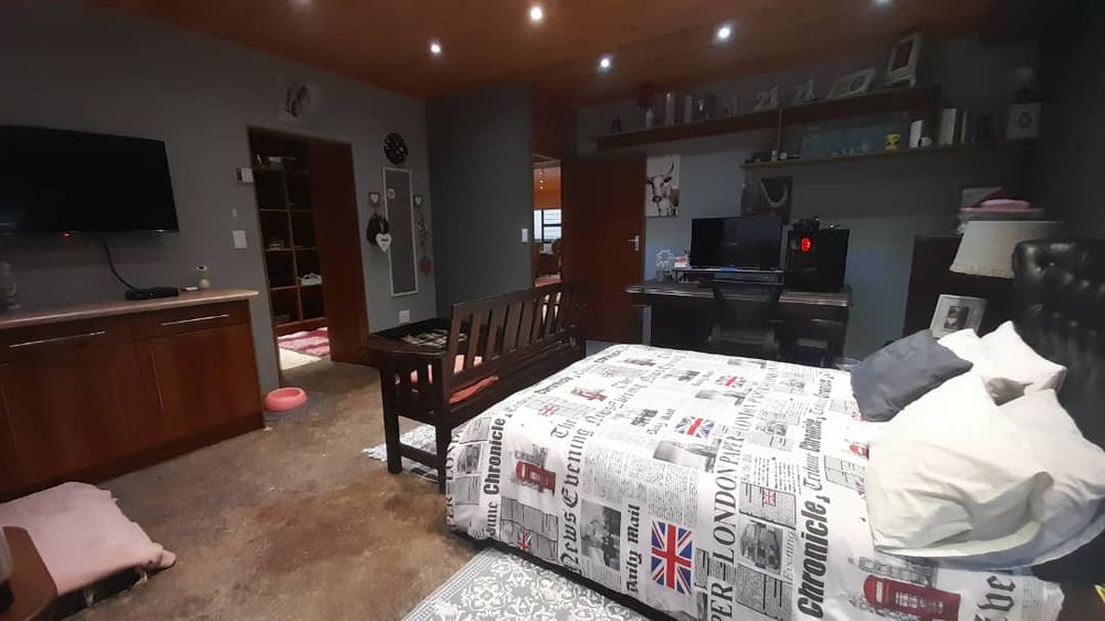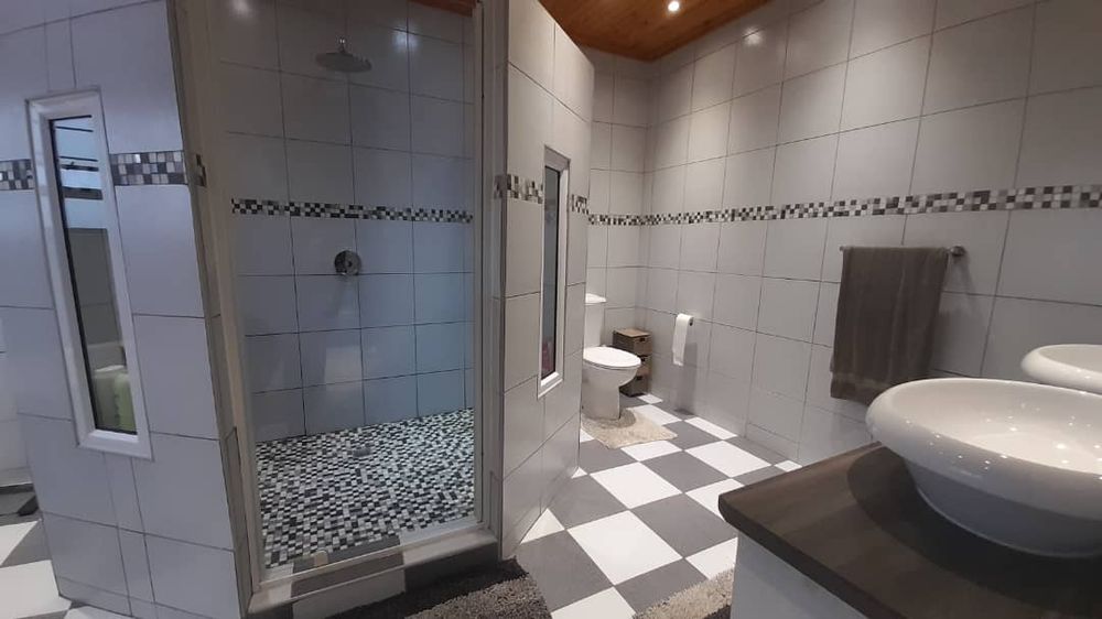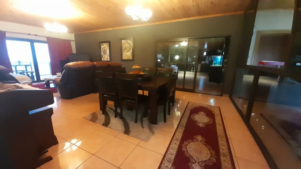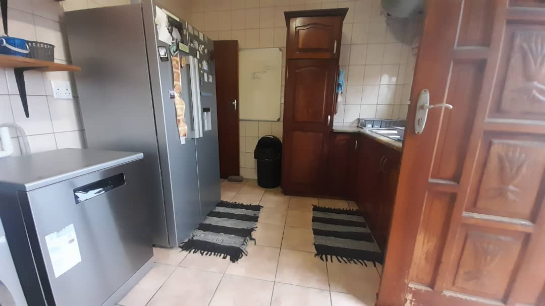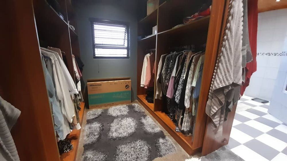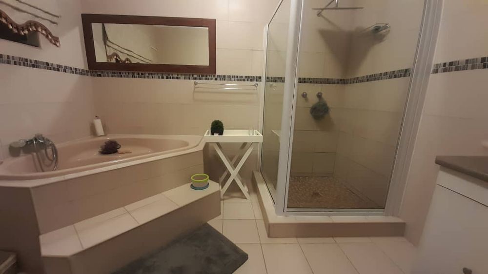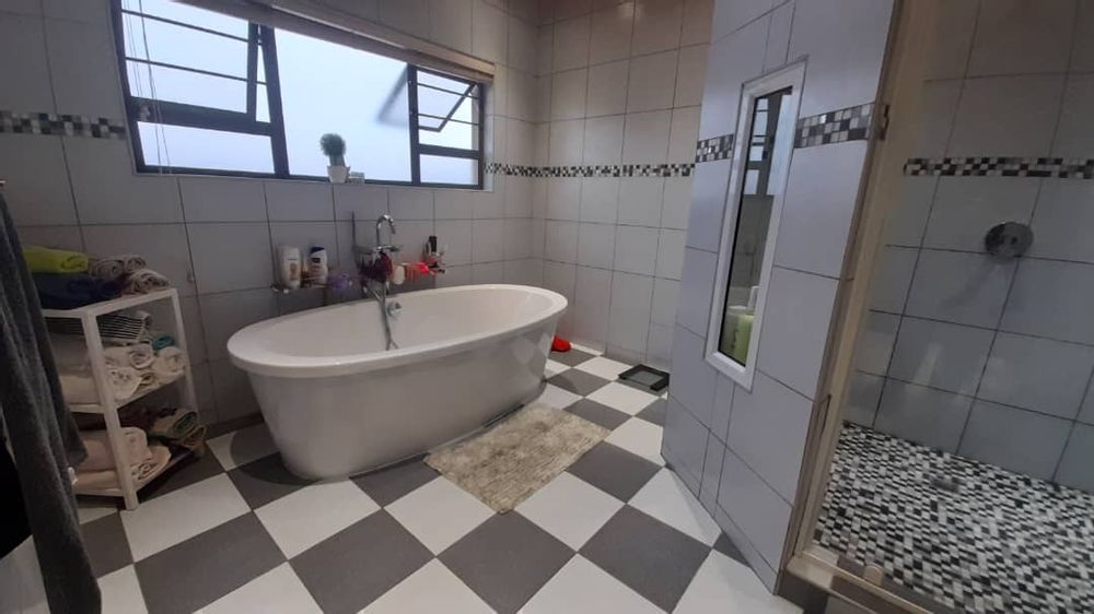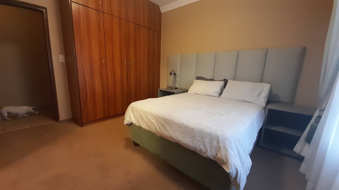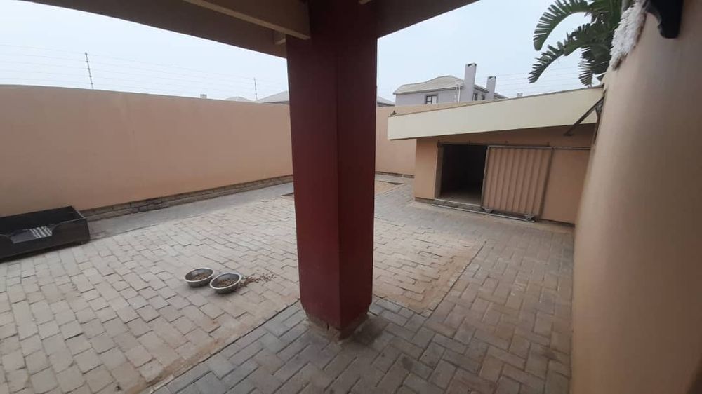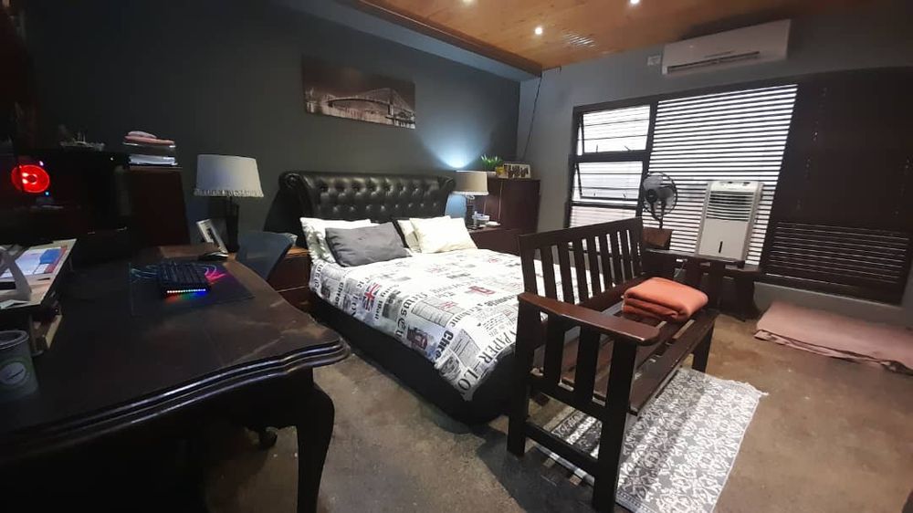 The ground floor features two generously sized bedrooms with en-suite bathrooms, a guest toilet, and an open plan kitchen with elegant rosewood cupboards that seamlessly flows into the living room. Other highlights include an indoor braai, pantry, scullery, and laundry room. The three-car garage, which can accommodate up to five cars, provides ample space for parking and storage. Additionally, there is a large storeroom and a versatile servant's room with a bathroom that can also serve as an extra bedroom.