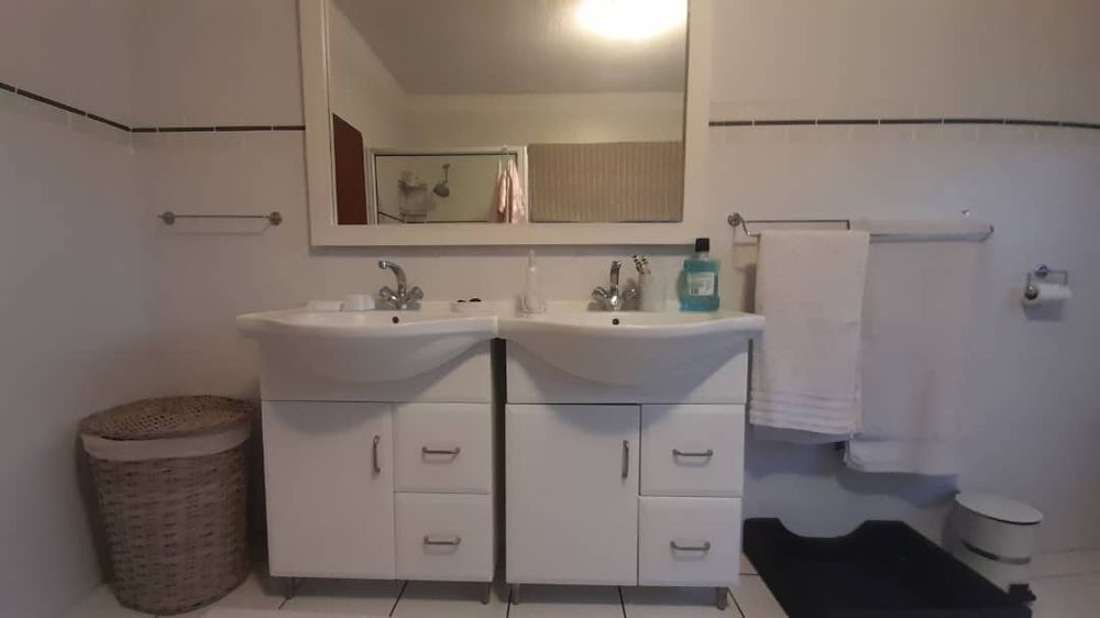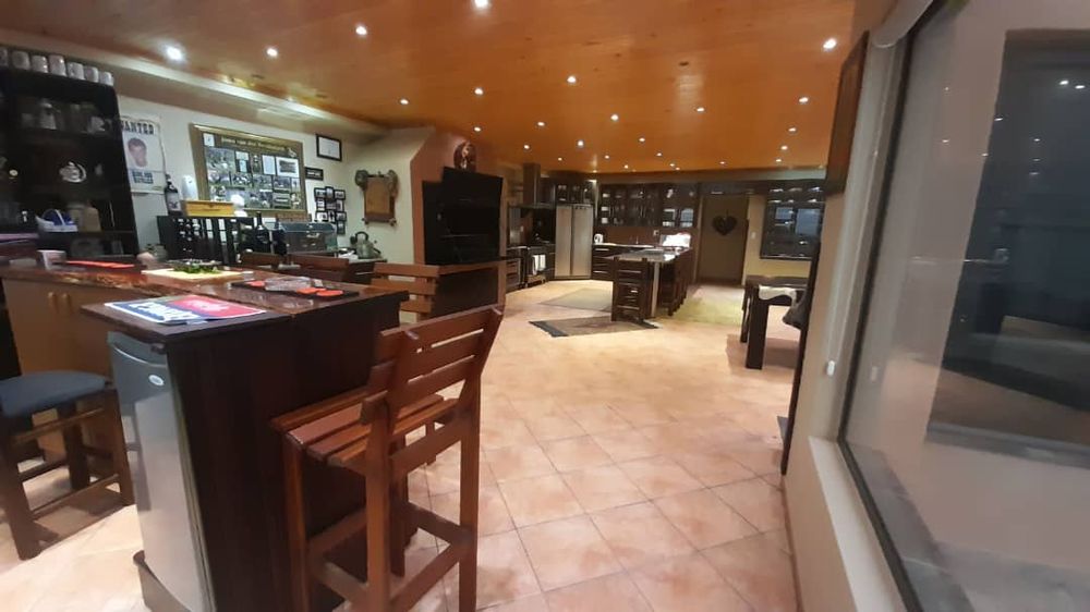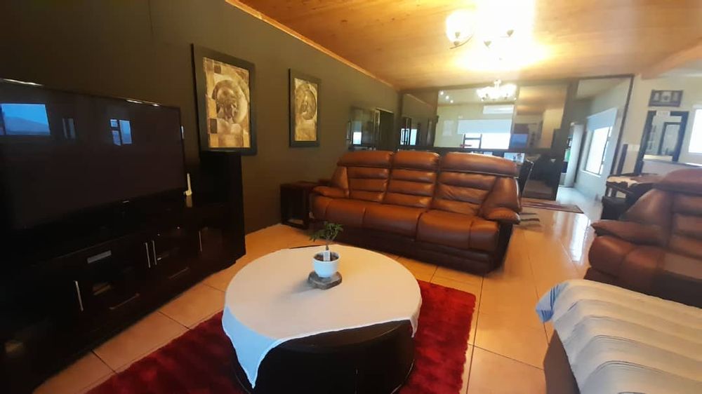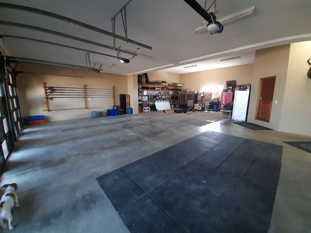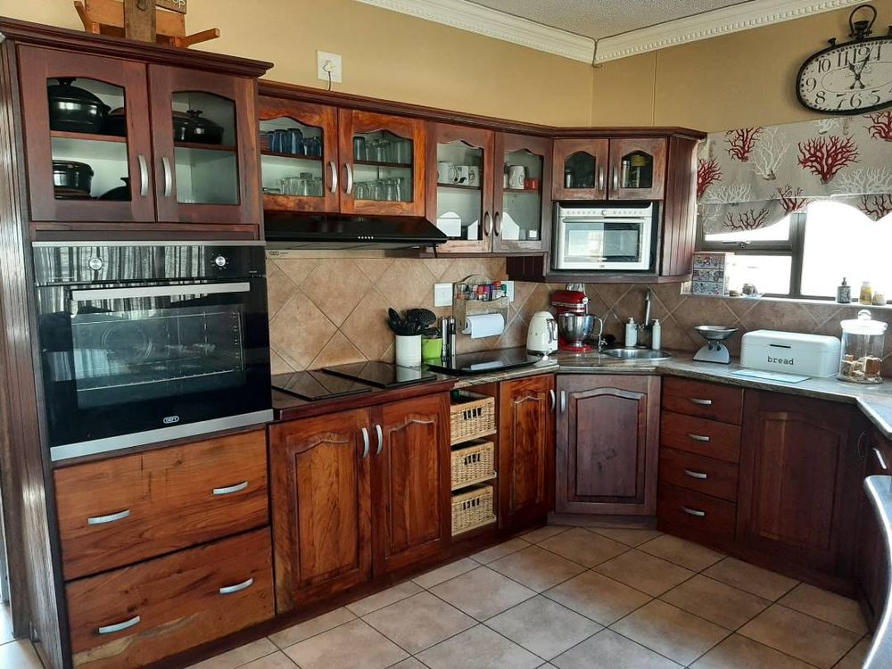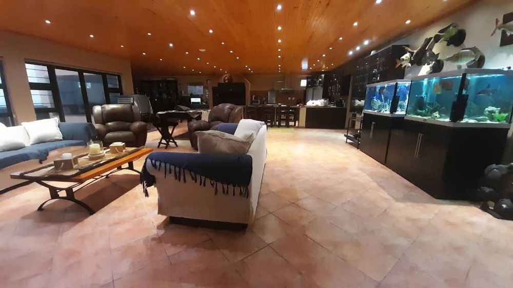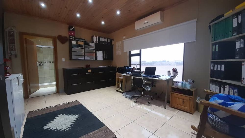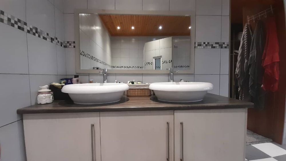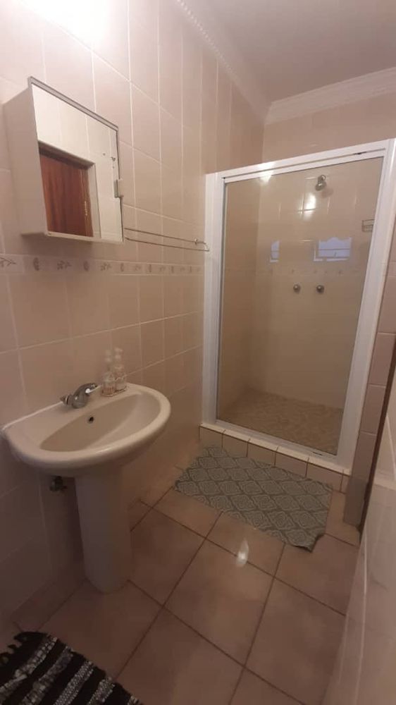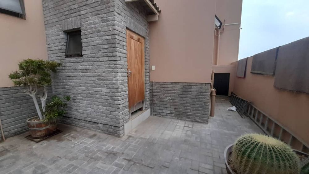 The ground floor features two generously sized bedrooms with en-suite bathrooms, a guest toilet, and an open plan kitchen with elegant rosewood cupboards that seamlessly flows into the living room. Other highlights include an indoor braai, pantry, scullery, and laundry room. The three-car garage, which can accommodate up to five cars, provides ample space for parking and storage. Additionally, there is a large storeroom and a versatile servant's room with a bathroom that can also serve as an extra bedroom.