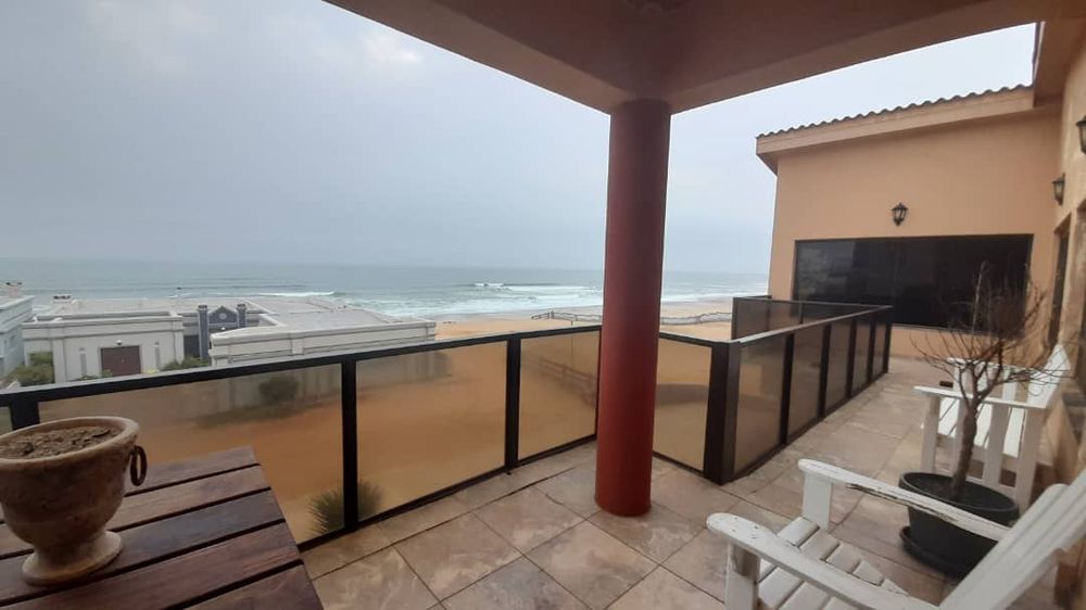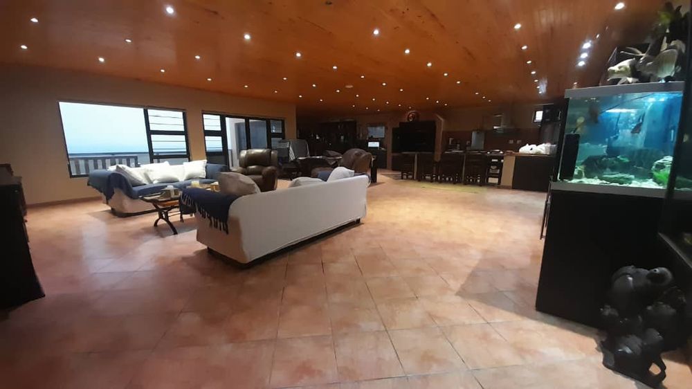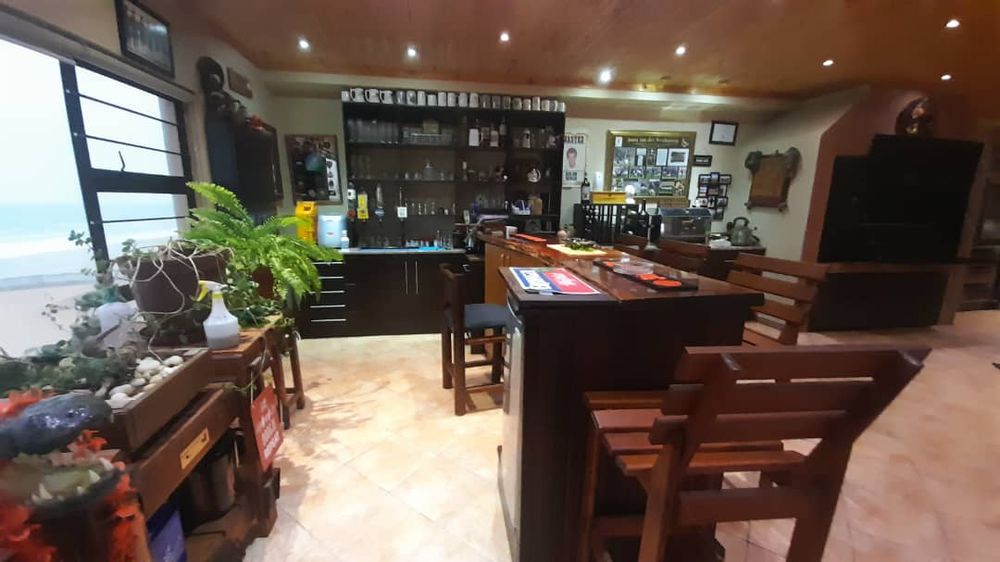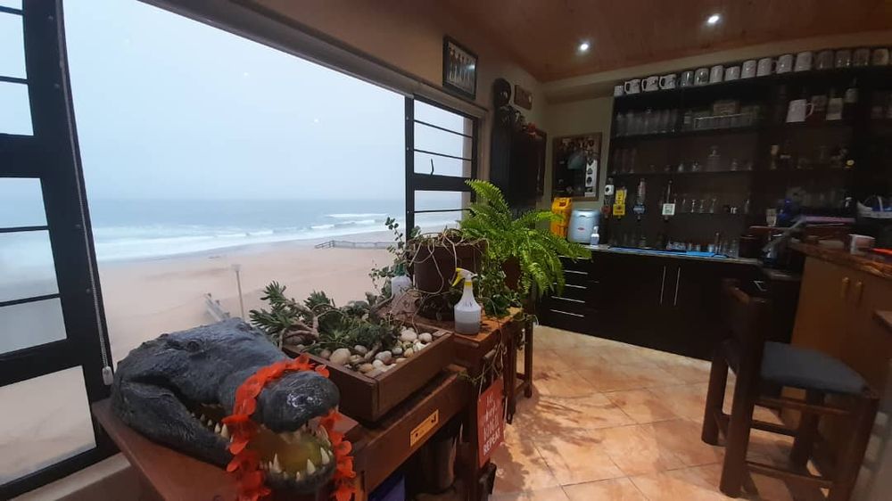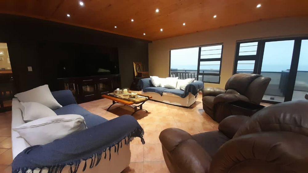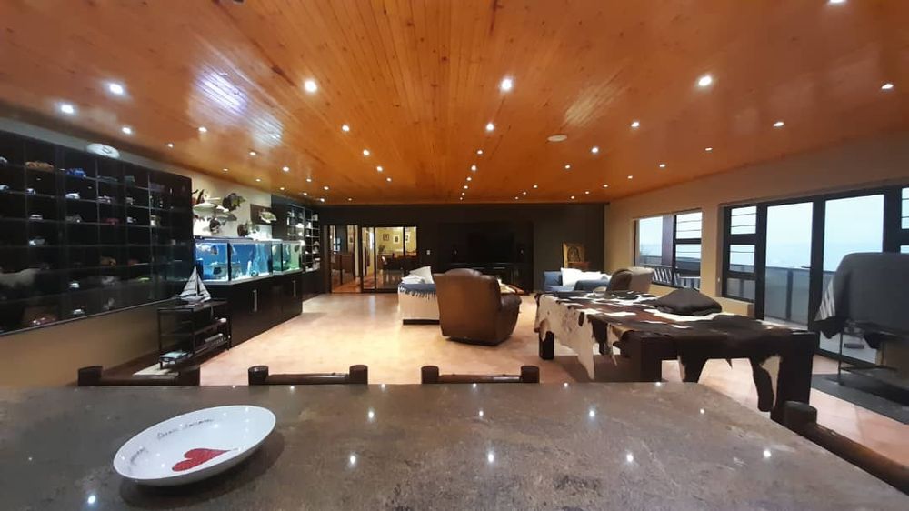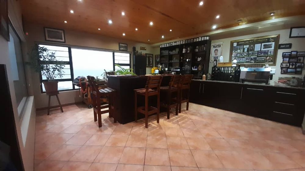 Upstairs, you'll find four bedrooms, two of which boast en-suite bathrooms, along with a study that can easily be converted into a fifth bedroom with its own bathroom. The TV room opens up to an entertainment area with sliding doors that lead to a spacious balcony offering breathtaking sea views. The entertainment area is equipped with a built-in BBQ/SPIT BRAAI, a fitted kitchen, and a bar area, making it perfect for hosting gatherings and enjoying the coastal lifestyle.