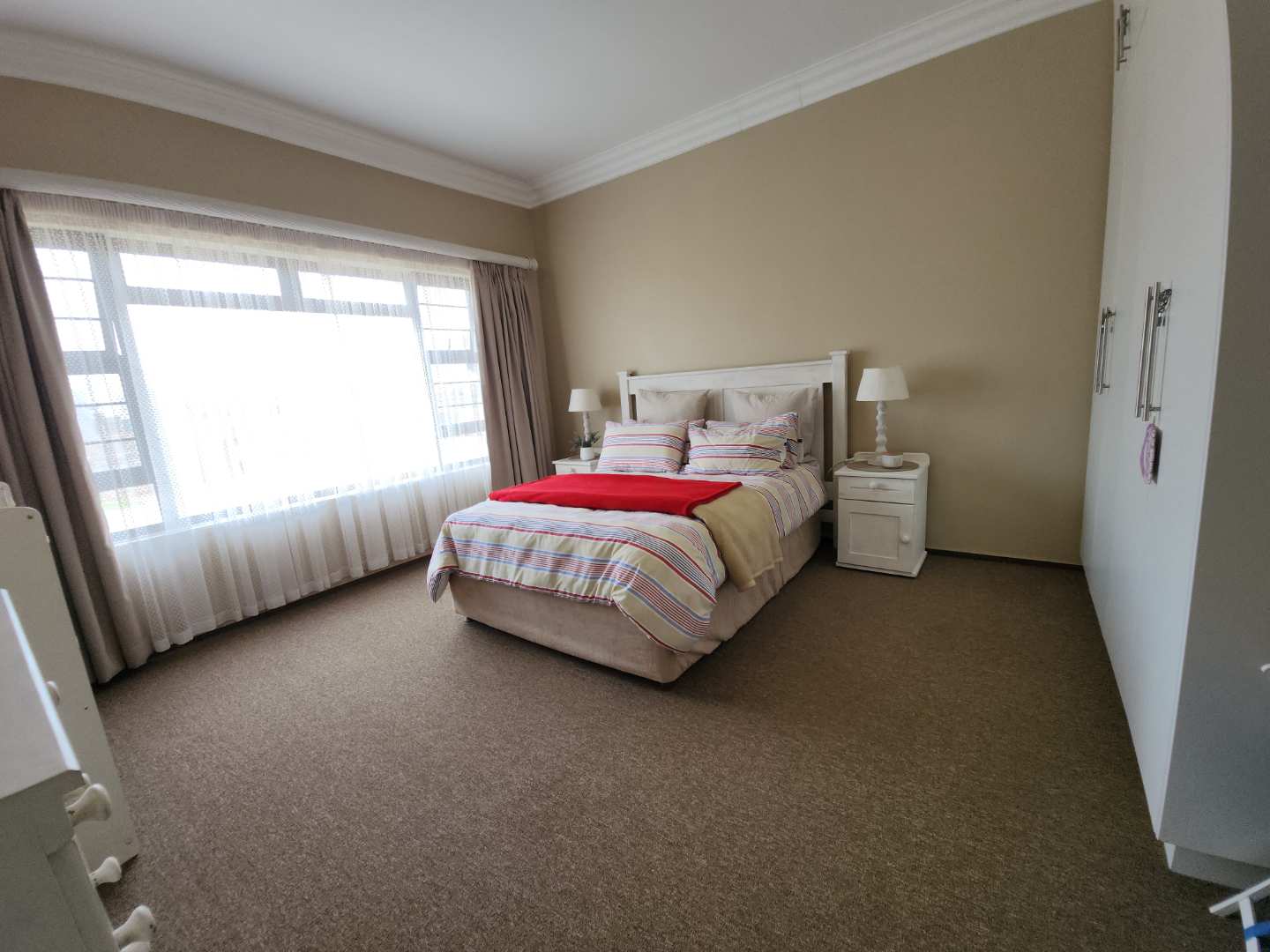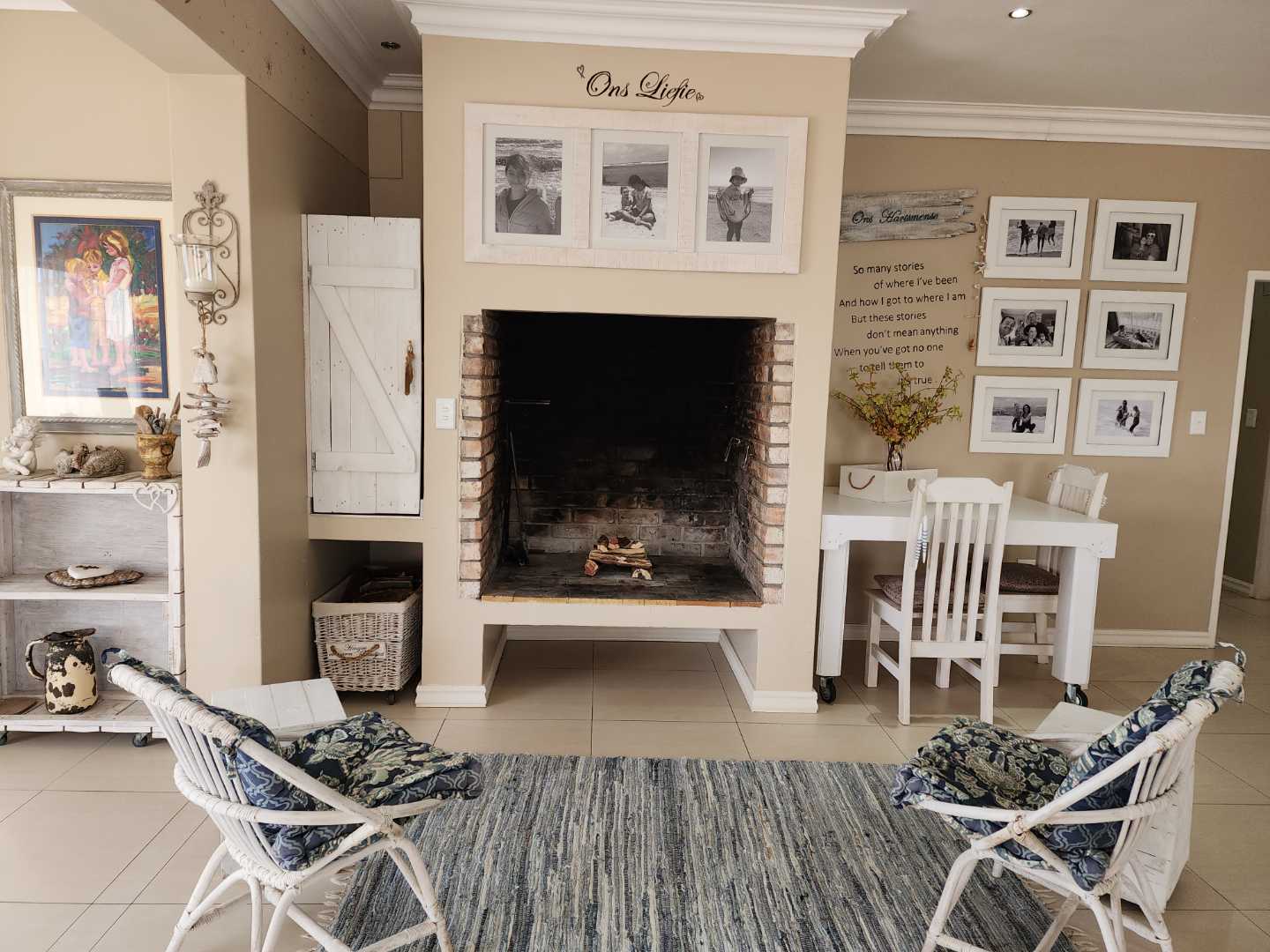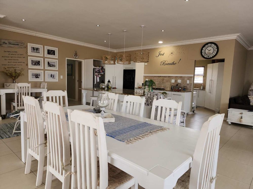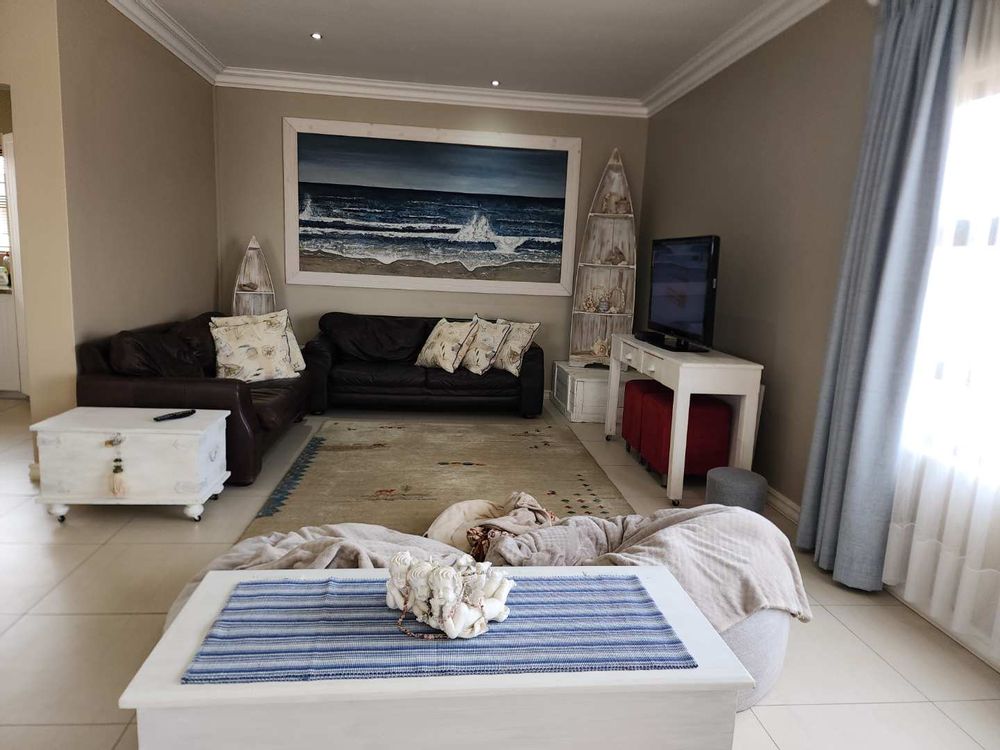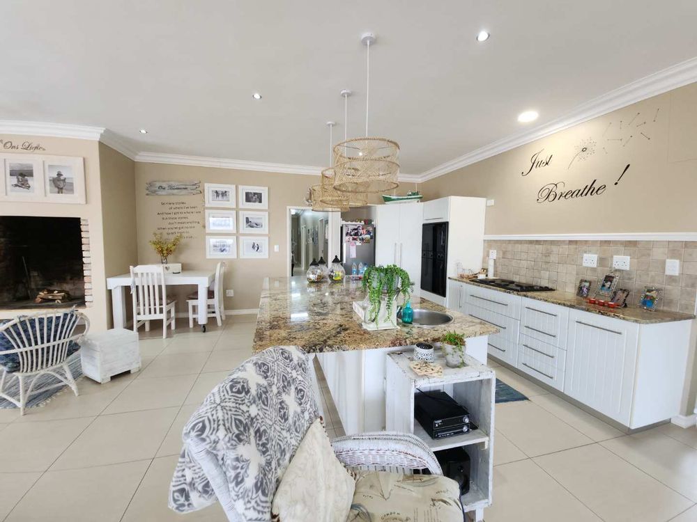 As you step inside, you are greeted by a bright and spacious open-plan living area that seamlessly integrates the living, dining, and kitchen spaces. The modern kitchen is fully equipped with all the essentials for effortless living, while the indoor braai area provides an ideal setting for entertaining guests or enjoying quality family time. Large windows throughout the home invite an abundance of natural light, offering distant ocean views that enhance the tranquil ambiance.
