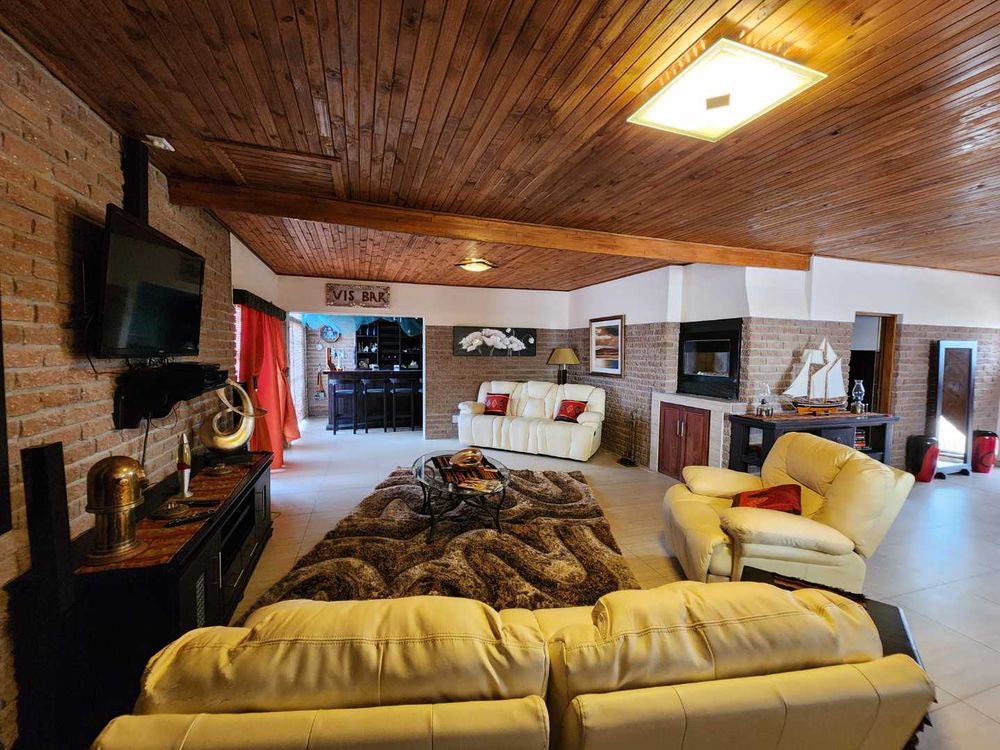 The expansive living area is designed for both relaxation and entertainment. It includes a dining area, a lounge/TV room, and features an indoor BBQ and bar, perfect for hosting gatherings. The kitchen is a chef's delight, equipped with granite countertops, a breakfast nook, and a pantry, ensuring ample storage and preparation space.