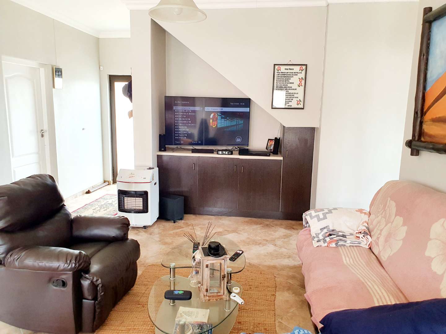 The heart of the home lies in the thoughtfully designed kitchen featuring built-in cupboards and a sliding door that seamlessly connects to the outdoor braai area. The open-plan living room exudes a welcoming ambiance, with a built-in BBQ perfect for hosting gatherings regardless of the weather.