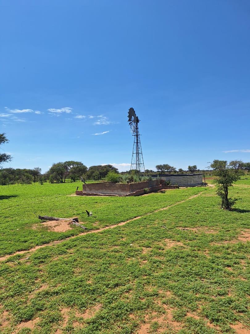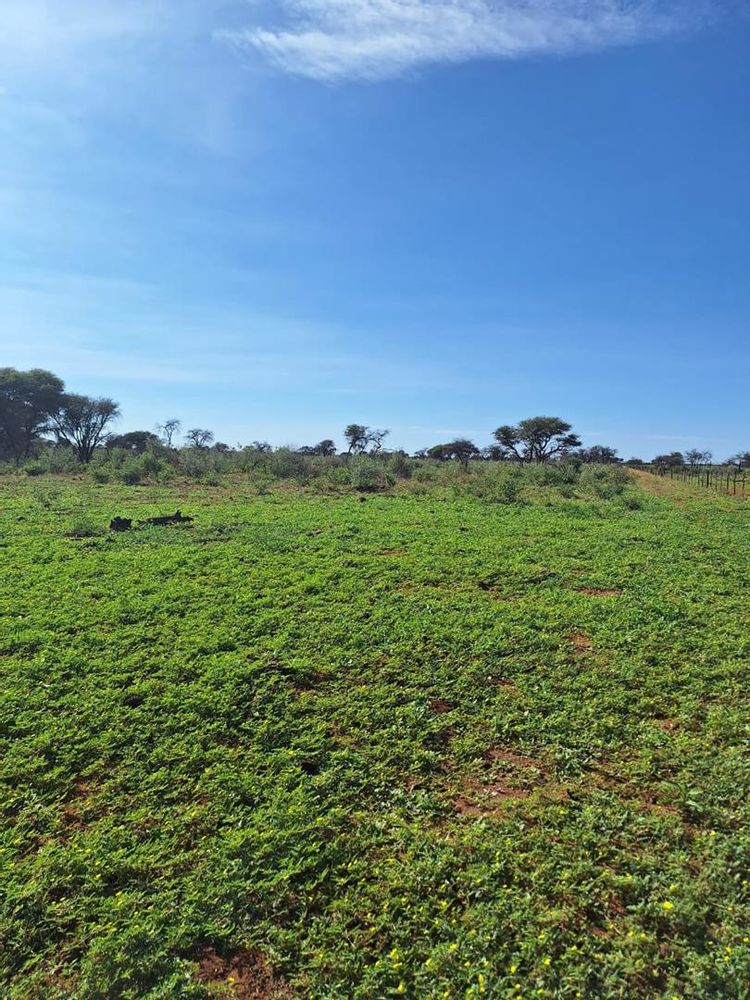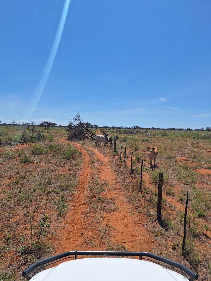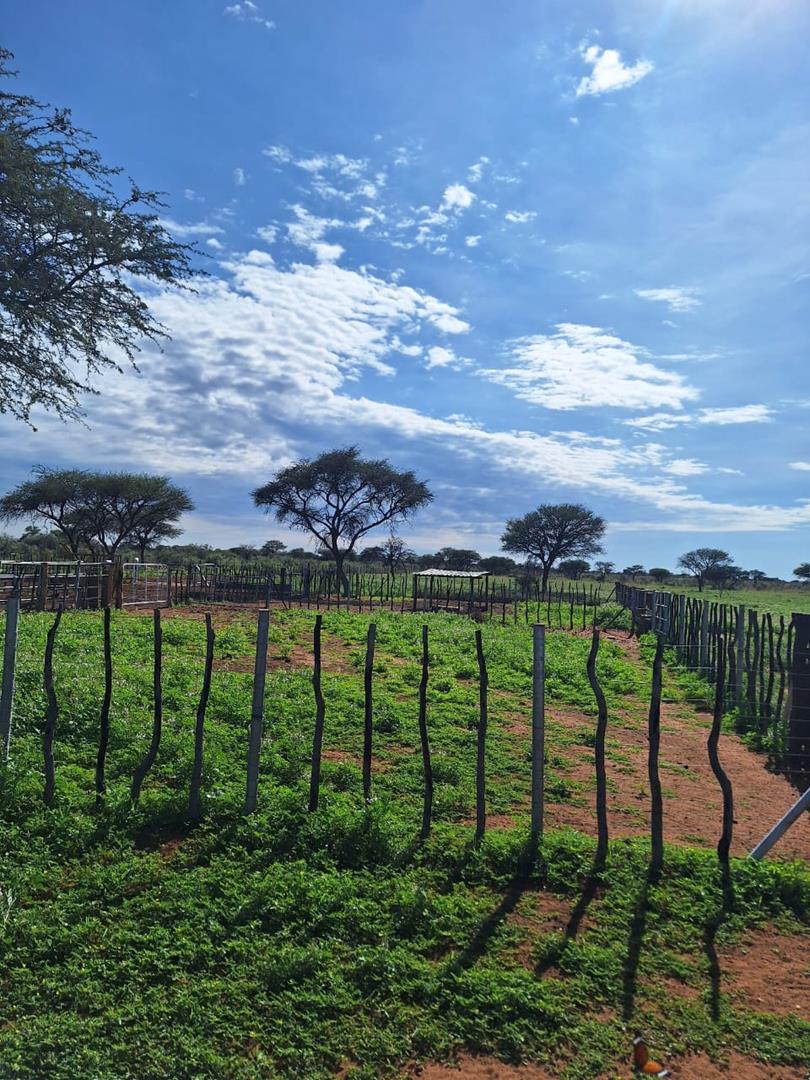 The land features sand and lime ground, supporting diverse grazing types such as Buffalo Grass, Blackfooted Brachiaria, Bushmen Grass, Schmidtia Grass, Meerjarige Beesgras, Anthephora, Rosyntjiebos, Wag-'n-Bietjie, Kampferbusch, Shepherd’s Tree, Camel Thorn, and Acacia.