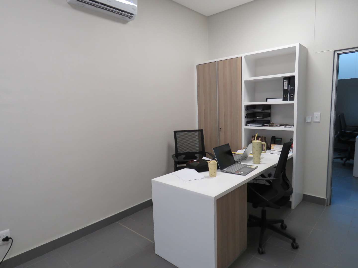 Upon entering, you'll be greeted by a thoughtfully designed office space that promotes productivity and efficiency. Adjacent to the office, a welcoming reception area awaits, offering a professional first impression for your clients and visitors. The property also includes a convenient kitchenette, perfect for quick breaks and informal meetings.