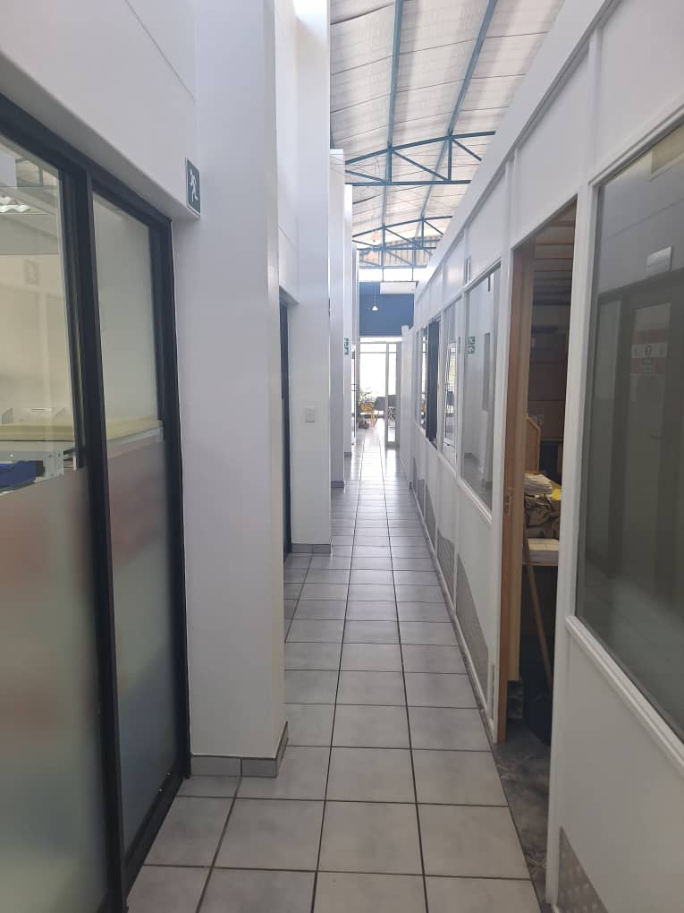 The interior features a range of dry wall partitioned offices that can be easily customized to suit your specific needs with an under roof size of 597 sqm. Additionally, the property includes a spacious boardroom, a welcoming reception area, and a convenient kitchenette, female/male ablution, providing everything you need to operate efficiently.