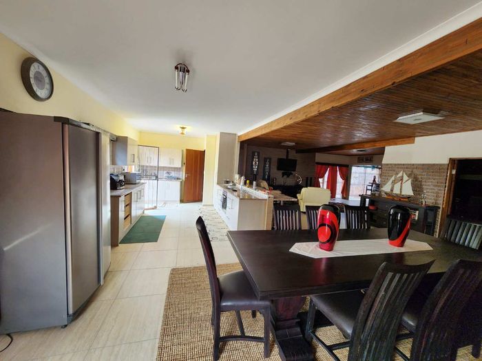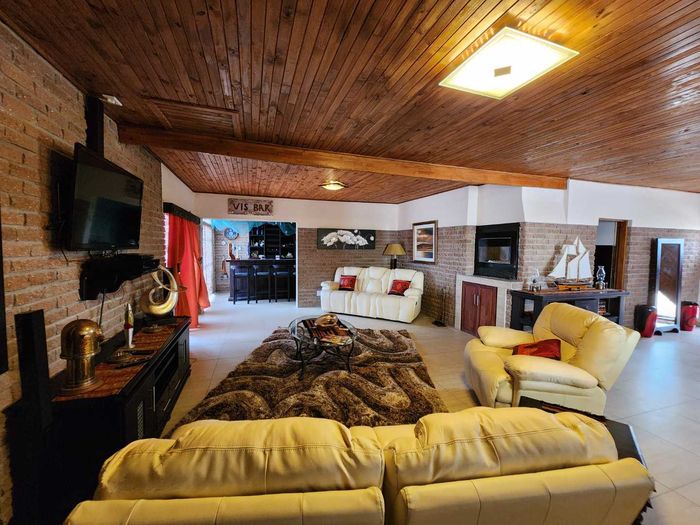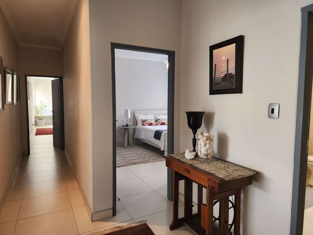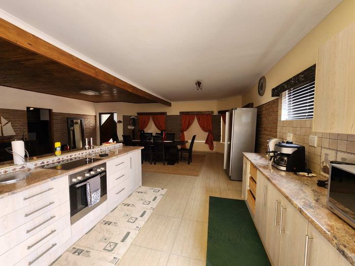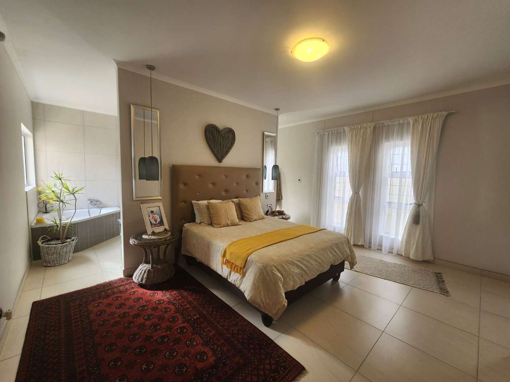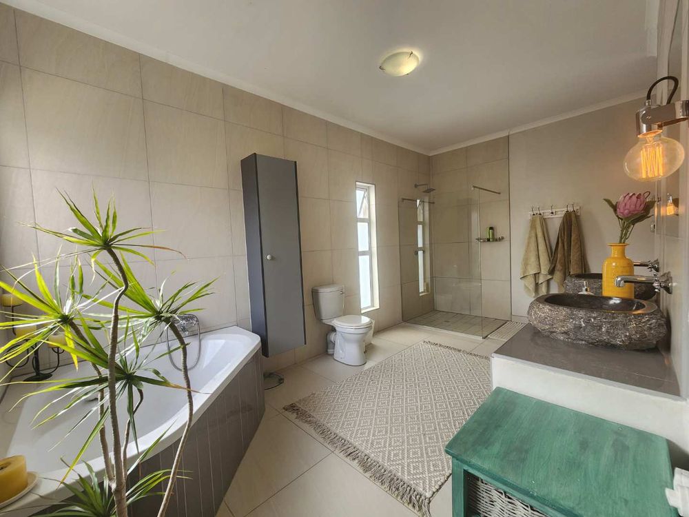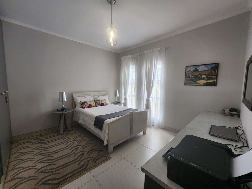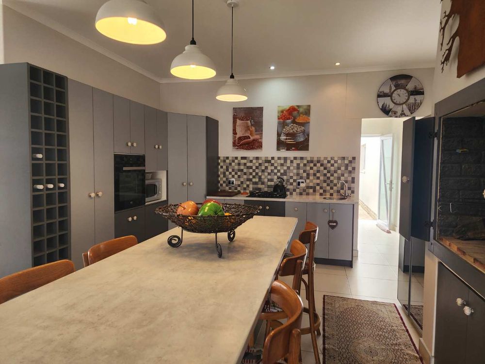 The home boasts a dedicated braaikamer, complete with a sizable fireplace and staggered aluminum doors that open up to the inviting outdoor garden. The kitchen is a chef's delight, offering ample storage space and a large separate scullery with a generous pantry, ensuring all your culinary needs are met with ease.