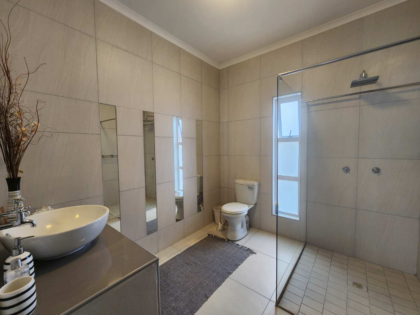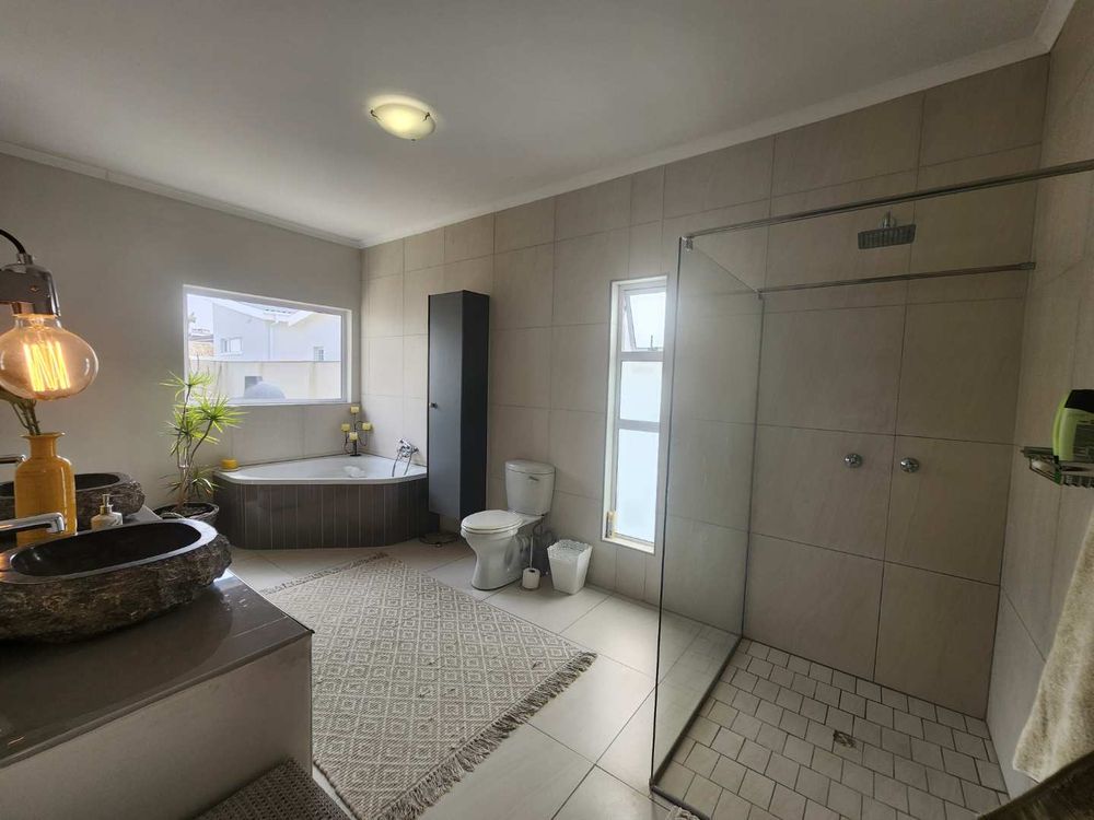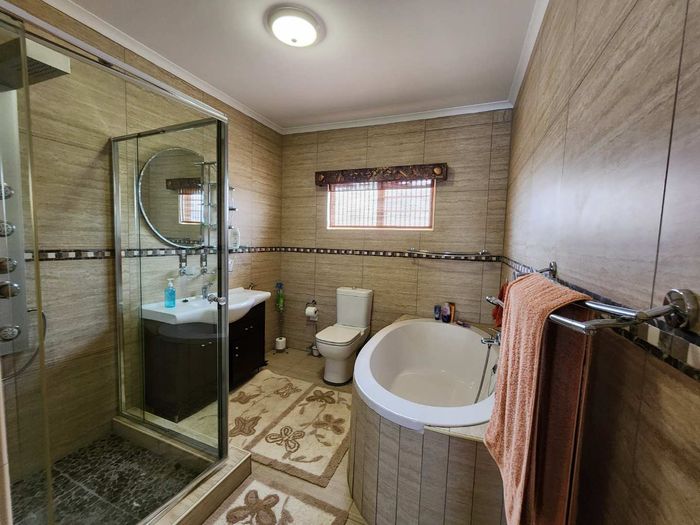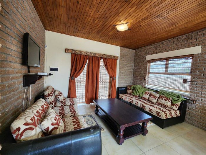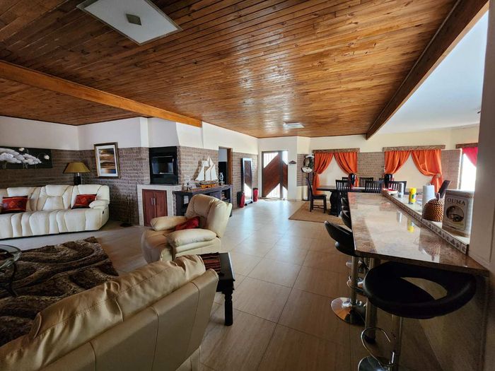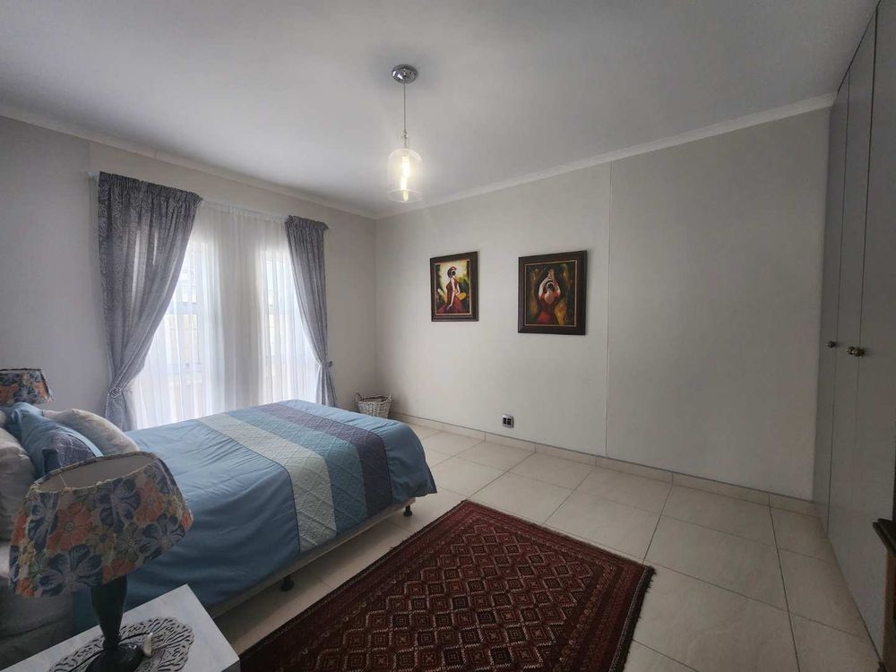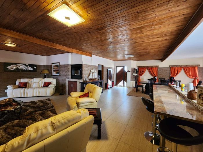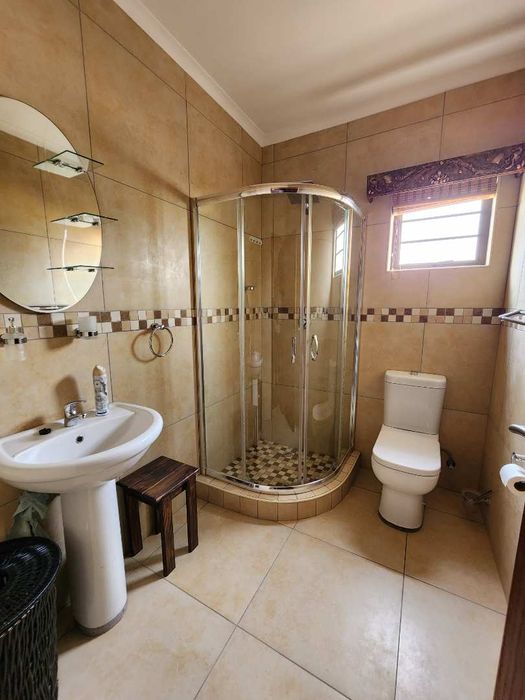 The home boasts a dedicated braaikamer, complete with a sizable fireplace and staggered aluminum doors that open up to the inviting outdoor garden. The kitchen is a chef's delight, offering ample storage space and a large separate scullery with a generous pantry, ensuring all your culinary needs are met with ease.