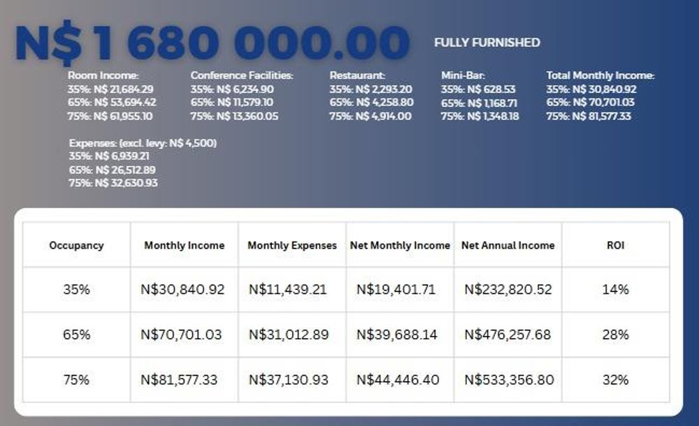 Financial projections highlight the potential income and expenses associated with varying occupancy rates. At 35% occupancy, investors can anticipate a monthly income of N$30,840.92 with expenses amounting to N$6,939.21 (excluding a levy of N$4,500). At higher occupancy rates of 65% and 75%, monthly incomes soar to N$70,701.03 and N$81,577.33 respectively, with corresponding expenses of N$26,512.89 and N$32,630.93